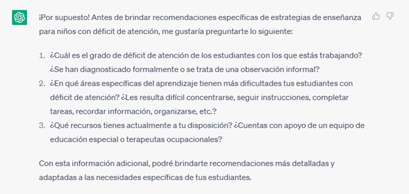 Este enfoque es particularmente efectivo cuando se abordan temas complejos o de múltiples capas, ya que ayuda a ChatGPT a identificar las áreas que necesitan una mayor exploración. Por ejemplo, si estás buscando información sobre el impacto de la tecnología en la educación, puedes preguntarle a ChatGPT: "¿Cuáles son los principales efectos de la tecnología en la educación?" y posterior a ello, decirle que te haga preguntas ANTES de responderte; al hacerlo, este puede realizar preguntas de seguimiento para profundizar en el tema y darte una respuesta más acertada.